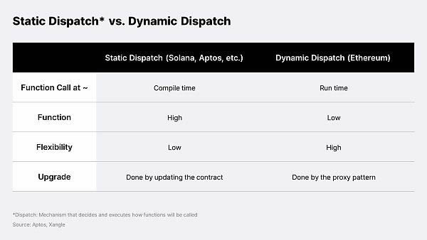 在灵活性方面,Solidity/EVM 比 Move/MoveVM 有优势。 Solidity/EVM 使用动态调度,而 Move/MoveVM 使用静态调度。 Move 使用静态调度增强了智能合约的安全性,但与 Solidity 相比限制了其功能。 此外,Solidity 允许随时升级协议和合约代码,而 Move 对这些升级施加了限制。 在区块链之间的互操作性方面,Solidity 比 Move 表现出更大的灵活性和可扩展性,主要是因为 Team EVM(包括以太坊)偏向模块化区块链,而 Team Move 则倾向于整体区块链。
