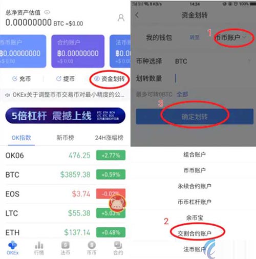 1.资金划转:(资金划转:如图OKEX目前有好几个账户包括我的钱包、币币账户、合约账户、法币账户,如果新人买币后发现币币账户还是空的,是因为你买的币还在法币账户中,需要划转到币币账户才能进行交易。如果进行合约交易,则需要划账至合约账户中)如图点击1.---2.交割合约账户--划转数量---3.确认划转。