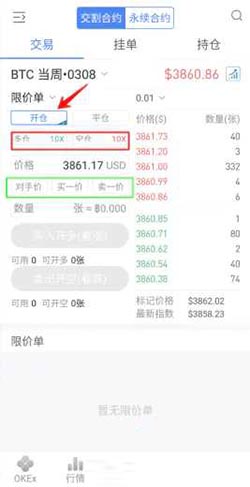 在交易界面点击开仓---看涨选择“买入开多”,看跌则选择“卖出开空”---根据情况选择杠杆倍数(红框内是杠杆倍数)----输入价格或选择绿框内开单计价方式下单---输入数量---然后点击“买入开多”或“卖出开空”。