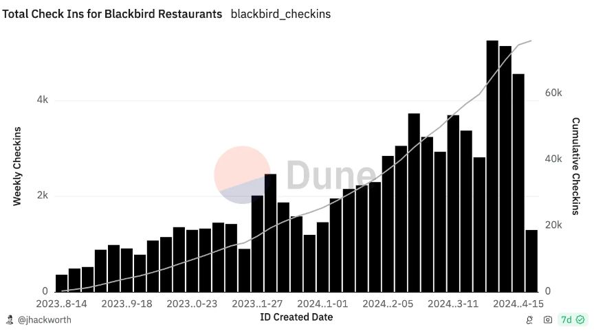 Blackbird在其用户群中每天的签到数仍在持续增长。