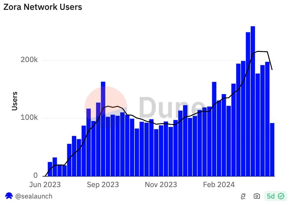 Zora链(也被称为Zora网络)已经上线了大约一年。在此期间,该网络一直在稳步发展。每周活跃用户较年初增长了约60%,最近刚刚突破了25万的新高。该链还享受着大约34%的利润率,这意味着Zora能够留下用户在交易费用上花费的以太币的约三分之一。