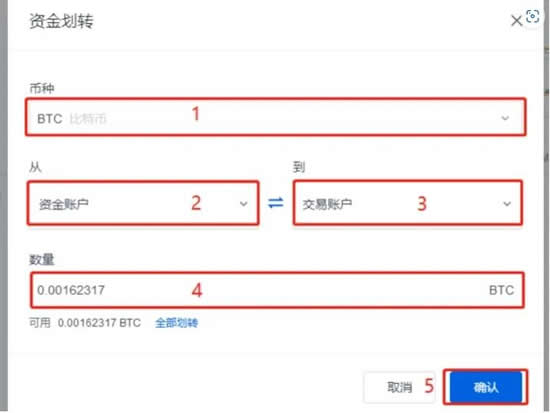 8、选择币种,以【BTC】为例—从【资金账户】—到【交易账户】—输入划转【数量】—【确认】。
