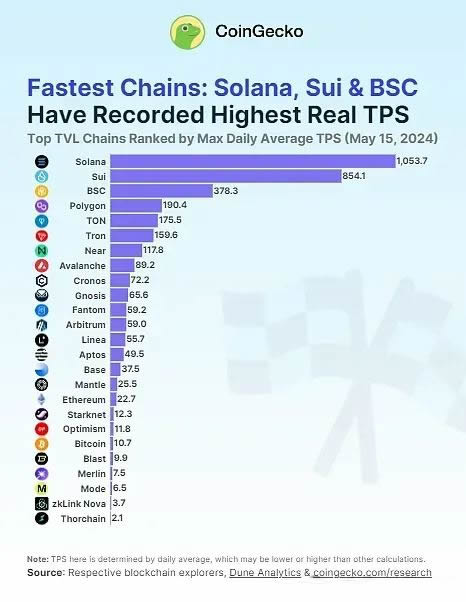 CoinGecko 于 5 月 17 日发布的 《Fastest Chains》报告中显示,Solana 是大型区块链中速度最快的,最高日均真实 TPS 达到 1,504(已经去除了投票交易),Sui 是第二快的区块链,最高日均真实 TPS 达到 854,BSC 排名第三,但达到的真实 TPS 还不到 Sui 的一半。