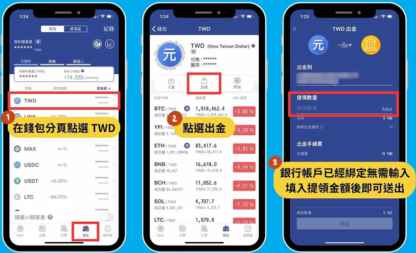 【钱包】→【TWD】→【出金】→输入提领金额→【送出】即完成