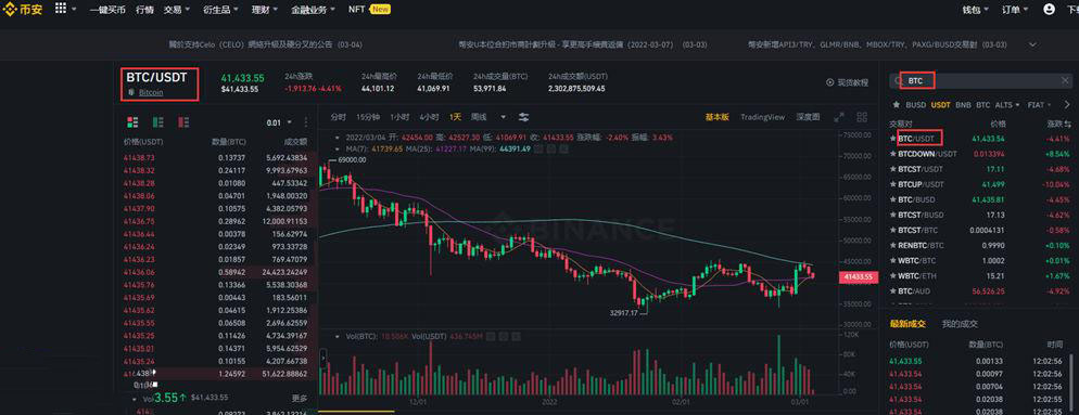 5、点击行情进入币种页面,搜索比特币英文简称BTC。