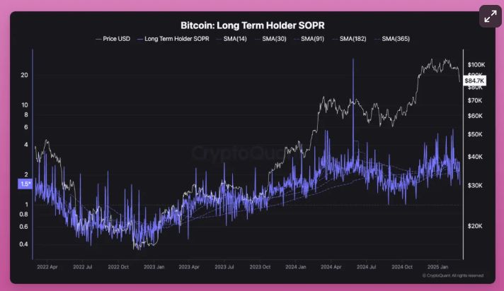 SOPR跟踪长期持有者是否在盈利或亏损时卖出。值大于1表示有获利了结的行为。
