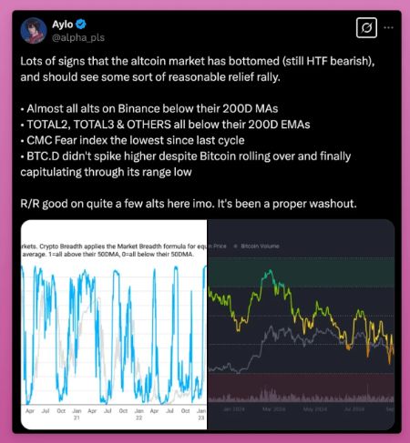 这与Aylo在X平台上分享的加密市场广度图类似,他表示山寨币已经触底,如果比特币保持强势,我们可以预期会有反弹。