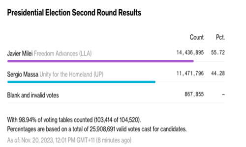 阿根廷的比特币友好派人士哈维尔·米莱在11月19日的总统决选中获胜,击败了对手塞尔吉奥·马萨。根据彭博社的数据,在选票统计接近99%的情况下,米莱赢得了超过55%的选票,领先对手近300万票。这一胜利表明,比特币在阿根廷的政治领域中具有一定的认可度,同时也为该国的政治格局带来了新的变化。