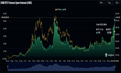 根据Coinglass的数据,全球衍生品巨头芝加哥商品交易所(CME)的比特币(BTC)期货未平仓合约持续增长,过去30天内从36.3亿美元攀升至52亿美元。这一显著增长与同期比特币26%的涨幅相互呼应,目前比特币的交易价格略高于44,000美元。尽管这一数据刷新了历史新高,但与2021年10月底的纪录相比,仍低了2亿美元。