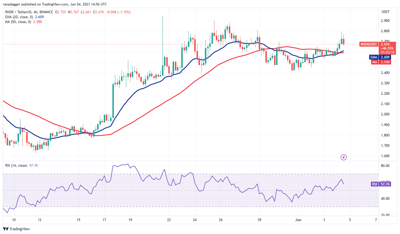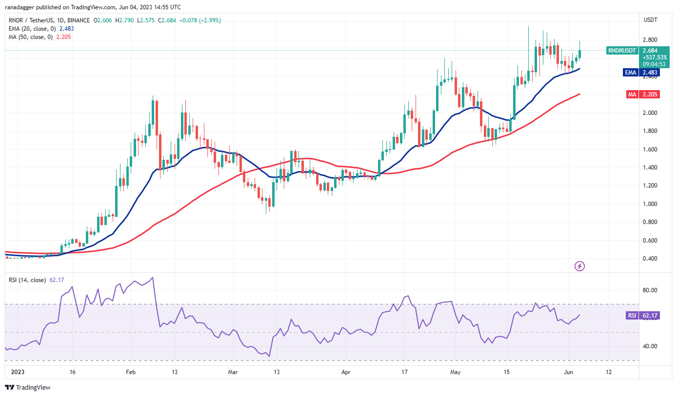 RNDR/USDT 对在 5 月 31 日跌至 20 日均线(2.48 美元),但多头成功捍卫了该水平。这显示了交易员逢低买入至强劲支撑位的积极情绪。该货币对可能会重新测试 2.95 美元的 52 周高点。如果克服这一阻力,该货币对可能飙升至 3.75 美元。