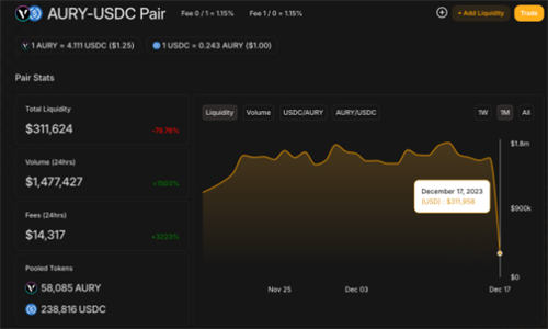 在撰写本文时,AURY的交易价格为1.23美元,在过去24小时内下跌了11%。这次攻击使代币价格跌至1.13美元。“攻击者打开图表,底部买家在45分钟内上涨了5倍,现在整个池子的流动性很小,”一位用户写道。