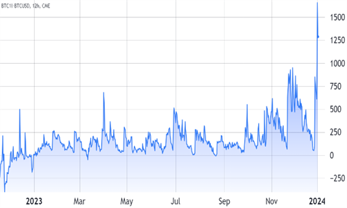 一位名为“Dump Watcher”的用户在X社交网络上发布了一篇帖子,指出这一走势发生在传统的美国股市开盘之前,暗示可能出现交易活动较少的时期。然而,情况并非如此,2024年首个交易小时内有4180份比特币期货合约成交,价值相当于9.45亿美元。这种看涨情绪并没有持续多久,1600美元的溢价(相当于53%的年化收益率)在全天的交易中下降到了500美元。