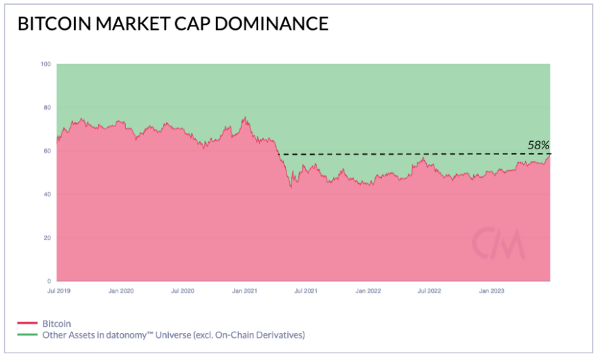 随着机构兴趣激增,比特币(BTC)再次占据了加密货币市场的中心舞台。这种兴趣得到了贝莱德、富达和方舟投资等主要金融巨头的刺激,它们已向美国证券交易委员会(SEC)申请推出现货比特币交易所交易基金(ETF)。根据Coin Metrics 的数据,BTC 的市值主导地位已达到 2023 年新高,目前为 58%,为 2021 年 4 月以来的最高水平。