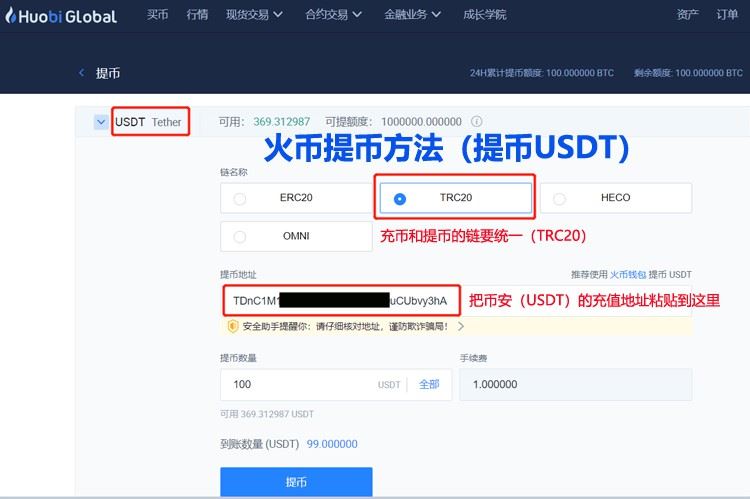这样就涉及到从一个交易所提币到另一个交易所,以下是从火币提币(USDT)到币安的流程(建议链上提币充币先换成USDT,不但到账快,手续费还便宜)。