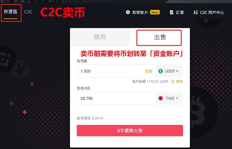 登录币安官网-先将USDT资金划转到“C2C账户”,在来到买币区选择“出售”,选择出售资产的数量,点击出售。