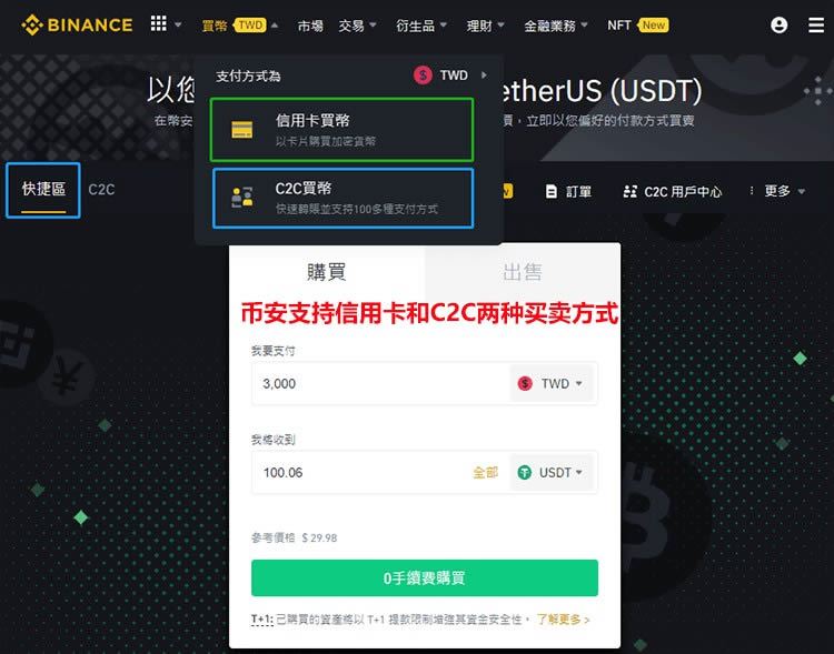在币安可以用法币购买USDT、BTC等基轴币种(台币/美元等法币充值)!由于比特币(BTC)波动较大,建议先购买稳定币USDT,再通过币币交易逢低买入比特币。以下为在币安购买USDT示范: