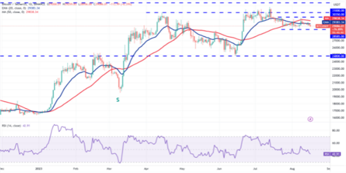 8 月 14 日,比特币升至 20 天指数移动平均线 29,383 美元上方,但烛台上的长影线显示在更高水平上出现抛售。