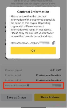 5. 接下来会看到一组二维码与充值地址。请在继续进行前小心确认充值网络与合约资讯。点选 【合约资讯】 旁的资讯图示可以查看详情。充值的资产合约地址必须与此处显示的地址完全一致,否则个人资产可能会遗失。
