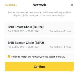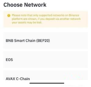 4. 接下来会看到充值该资产可用的网络。请小心选择充值网络,并确保选取的网络与提现资金的目标平台所属的网络皆相同。如果选择了错误的网络,个人资金可能会遗失且无法恢复。