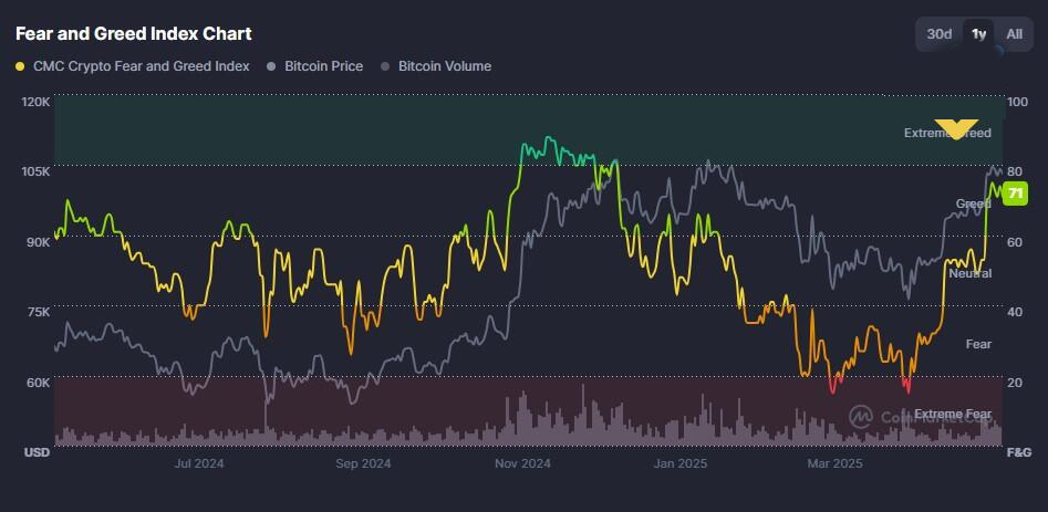 恐惧与贪婪指数值为 71,表明市场处于贪婪区。该指数反映出投资者兴趣高涨,但也预示着存在市场过热的风险。在此阶段,两种场景都有可能出现:资产价格可能在强劲需求的推动下继续上涨,也可能随着主要参与者开始平仓获利而经历回调。