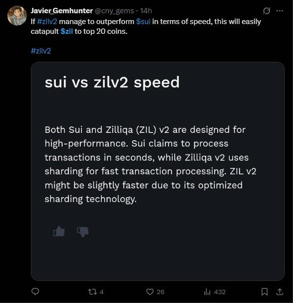 X(原 Twitter)上一位名为 @Javier_Gemhunter 的用户比较了 Sui 和 Zilliqa v2 网络的性能,并指出两者都注重高交易速度。该帖子的作者强调,由于 Zilliqa v2 采用了优化的分片技术,其速度可能会略快一些。此外,该用户还声称,如果 ZIL 的速度确实超过 Sui,那么它可能会跻身前 20 大加密货币之列。