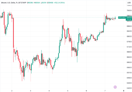 根据电汇市场和交易景的数据,上周末比特币价格意外地攀升至69,000美元之上,触及了当地的高点69,781美元。现在距离收盘仅剩数小时,交易者们预期在新的一周里会出现类似的周末情景,并期待涨势能够持续。