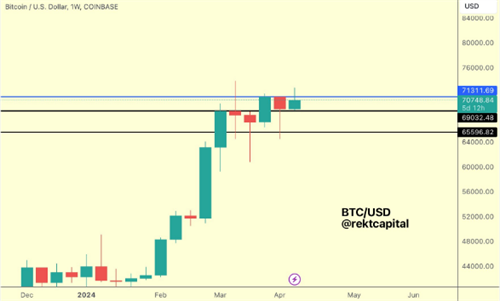 另一位知名交易员Rekt Capital在查看周线图时表示:“比特币目前正在试图突破这个蓝色区间的高点(7.13万美元)。”