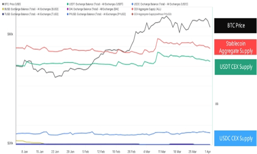 稳定币平衡的增长历来被视为决定市场交易者定位的良好指标。根据CoinGlass的研究,稳定币流入交易所的增加在3月份推动了比特币价格上涨至历史新高。分析师表示:“USDT和USDC继续领头发行和流入交易所,这有助于将BTC推向历史高位。”