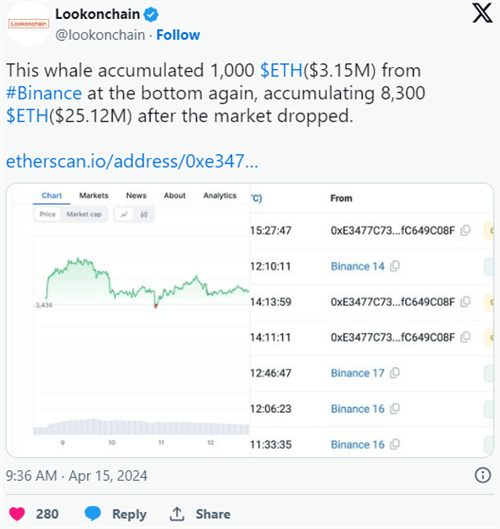 其中,一位被称为“0xE34”的大鳄,精准地在市场最低点从币安购买了1000枚以太坊,总价值约为315万美元。
