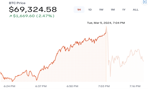 到2月,比特币已经飙升超过50000美元,并且正在重拾昔日的辉煌。然后,在3月5日,它终于实现了:比特币突破了69000美元的关口,创下了以美元计价的历史新高。