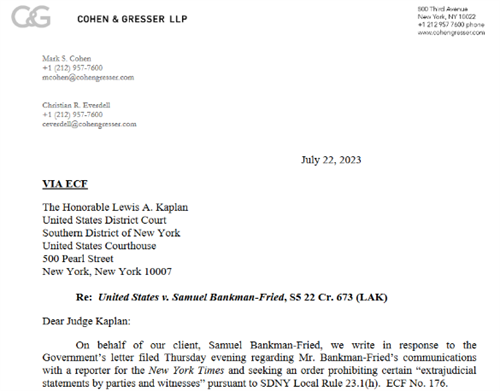 班克曼-弗里德的律师 Cohen & Gresser LLP在 7 月 22 日写给纽约美国地方法院法官刘易斯·A·卡普兰 (Lewis A. Kaplan) 的信中否认了这些指控,但同意按照要求接受 禁言令。