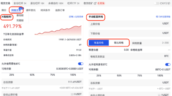 一键设置:基于近7天的历史数据,系统自动进行回测计算,为用户生成收益率最高的网格参数,包括上限价格、下限价格以及网格数量。