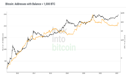 高于46,000美元时达到的2,489个地址的记录相比,虽然仍有一定差距,但已显示出强劲的增长势头。此外,链上情报公司CryptoQuant的研究主管也注意到了这一增长趋势,并指出“鲸鱼持有的比特币正在呈抛物线增长”。