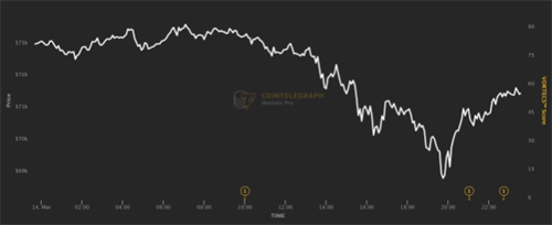 据数据显示,比特币在当日触及超过73,500美元的日内高点后,下跌了6.3%至68,855美元的低点。然而,此后比特币价格有所反弹,目前已回到71,600美元上方。