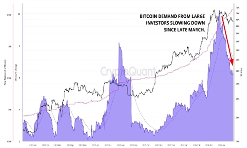 特别值得注意的是,来自永久持有者的比特币需求在4月份下降了50%,从3月底的超过20万桶降至约9万桶。这一数据表明,即使在比特币价格高企的时期,那些长期持有者也开始表现出谨慎的态度。