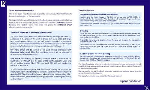 针对社区的反馈,EigenLayer决定调整其空投策略。在5月2日的公告中,Eigen基金会表示,现在将向4月29日之前与协议互动过的用户钱包进行额外的EIGEN代币空投,这包括最初的空投申领者。