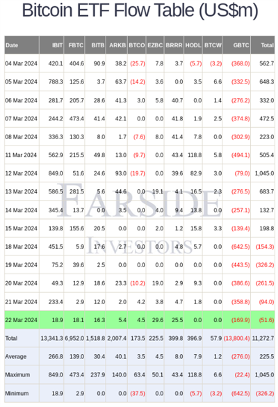 投资者和企业家阿利斯蒂尔·米尔恩指出:“由于GBTC销售大幅放缓,比特币交易所交易基金的净流量昨日跌至-51亿美元,这是一个关于流量的显著数据。”他认为,这可能意味着ETF市场的下行趋势即将结束,并有望迎来复苏。