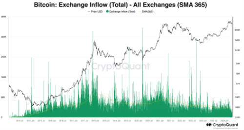据链上分析平台CryptoQuant提供的数据,自比特币创下73,800美元的历史高点以来,每日BTC流入量经历了显著下滑。这一趋势反映出交易者在当前市场环境下并不急于将比特币快速出售。