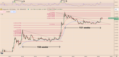 当前突破0.236斐波那契门槛的尝试类似于前一个周期中观察到的突破,这可能表明如果价格维持在当前0.181美元的水平以上,市场情绪将发生重大转变。