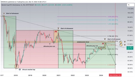 加密货币交易员Zero Ika在其社交媒体上向4.3万余名粉丝表示,如果我们从对数图表来看整体情况,“可以清楚地看到BTC的主导地位处于长期下降趋势”。