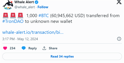 截止至5月13日,Tron DAO发起了一笔引人注目的比特币转账,总额高达1000枚BTC,估值约6500万美元。这一巨额资金流动被Whale Alert等交易平台捕捉并公示,随即在加密货币社区内激起了广泛的关注和讨论。