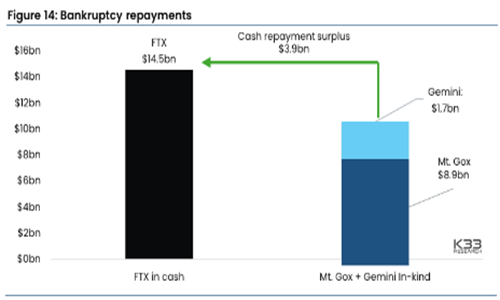 根据K33 Research分析师的最新报告,FTX交易所计划向债权人偿还的现金可能会在加密货币市场催生一波乐观预期。该计划预计将向因交易所破产而受损的用户支付至少145亿美元的现金,在5月16日由分析师Vetle Lunde和Anders Hesleth发布的这份报告中,他们认为,与普遍的看法相反,“并非所有债权人的还款都会对市场产生负面影响。”为了支持这一观点,他们将FTX的预期现金还款与Mt. Gox和Gemini计划的基于加密货币的还款方式进行了比较。据报告,后两者的还款计划“目前估值合计为106亿美元”。