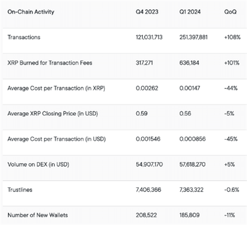报告详细指出,2024年第一季度,XRPL链上的交易活动增长了惊人的108%,交易记录数量从2023年第四季度的1.2103亿笔激增至本季度的2.5139亿笔。这一显著增长反映了XRP在数字货币市场中的日益活跃和受欢迎程度。