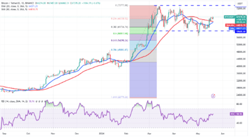 随着现货购买和现货比特币交易所交易基金(ETF)的购买热潮,比特币价格在5月21日成功突破7万美元,在加密货币社区内激起了广泛的讨论和关注。这一显著涨势不仅令投资者兴奋,也引发了市场对于新一波牛市是否即将到来的猜测。