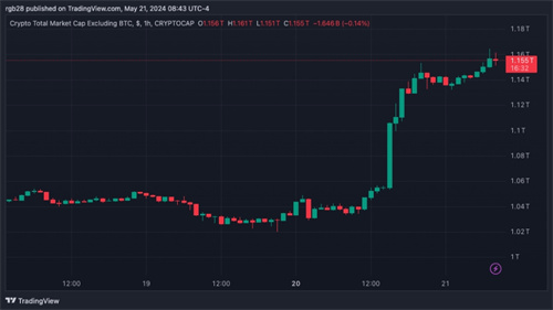 根据图表,山寨币市场现在正寻求重新测试3月份的1.27万亿美元阻力位,然后再测试上一个周期的1.7万亿美元ATH。对于crypto Yoddha来说,“我们正在考虑看涨的延续”,这将在第二轮中导致一个新的市场ATH。
