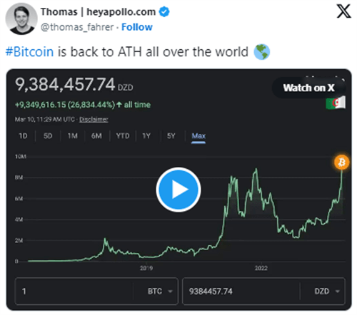 此次价格的大幅上涨,不仅让比特币在美元计价上接近历史高点,更在多个亚洲和南美国家创下了新的历史新高。据CoinMarketCap数据显示,在日本,比特币在5月21日早盘交易中一举突破1100万日元大关,创下1120万日元的历史新高,这也是比特币首次在日本市场价值超过1100万日元。与此同时,由于近几个月来日元兑美元汇率走弱,自1月份以来已下跌10%,因此比特币的这一涨势在日本市场尤为显著。