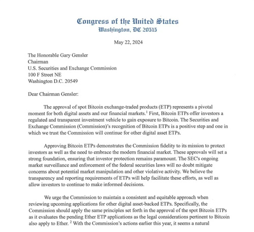据Eric Balchunas报道,一个由众议院两党议员组成的小组周二致信美国证券交易委员会主席,要求批准ETH etf“和其他数字资产”。