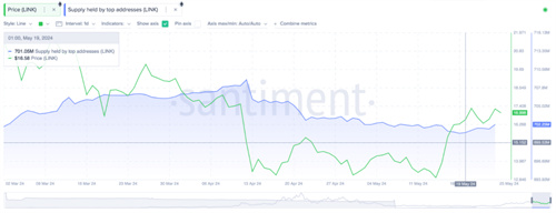 上面的Santiment图表实时显示了前100个最大钱包持有的LINK代币余额的变化。
