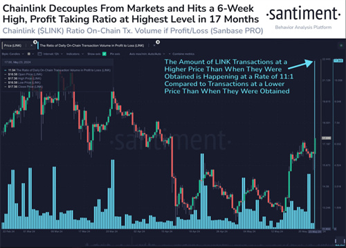 链上数据显示了对领汇的强烈购买情绪,创纪录的11笔盈利交易比1笔亏损交易。这种盈利能力的飙升与更广泛的市场对以太坊ETF的积极反应相吻合。分析人士认为,这一批准标志着机构对加密货币的兴趣日益浓厚,可能为专注于Chainlink等特定项目的类似工具铺平道路。
