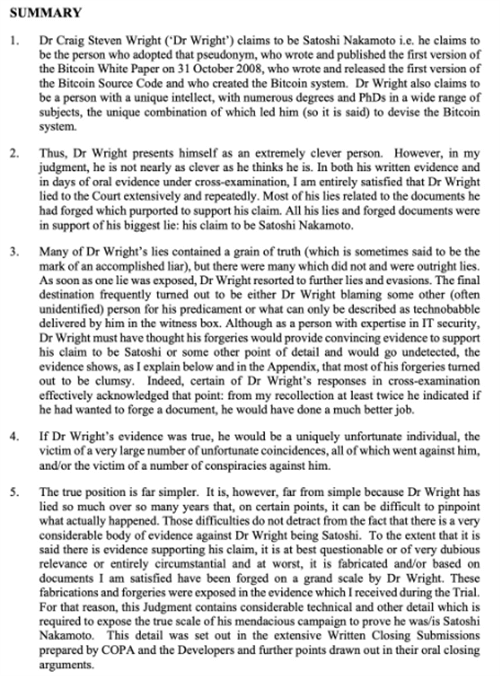法官詹姆斯·梅乐在由密码开放专利联盟(COPA)提起的民事诉讼中作出裁决,严词批评赖特在法庭上“一再撒谎”,并涉及“大规模的伪造”行为,以图证明其为中本聪的虚假身份。